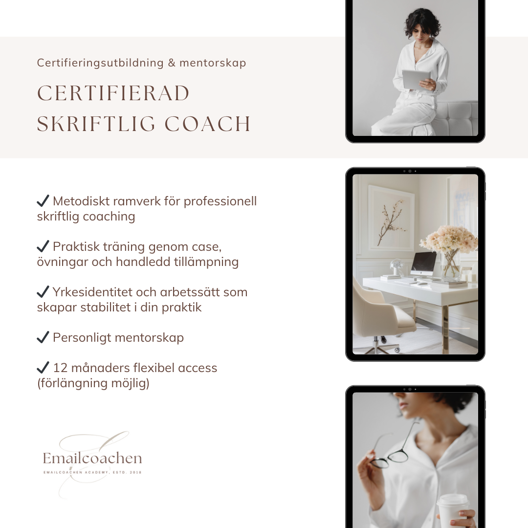 Skriftlig coaching är en kraftfull metod för dig som vill leda förändring med omdöme, tydlighet och respekt för både klientens och din egen energi.