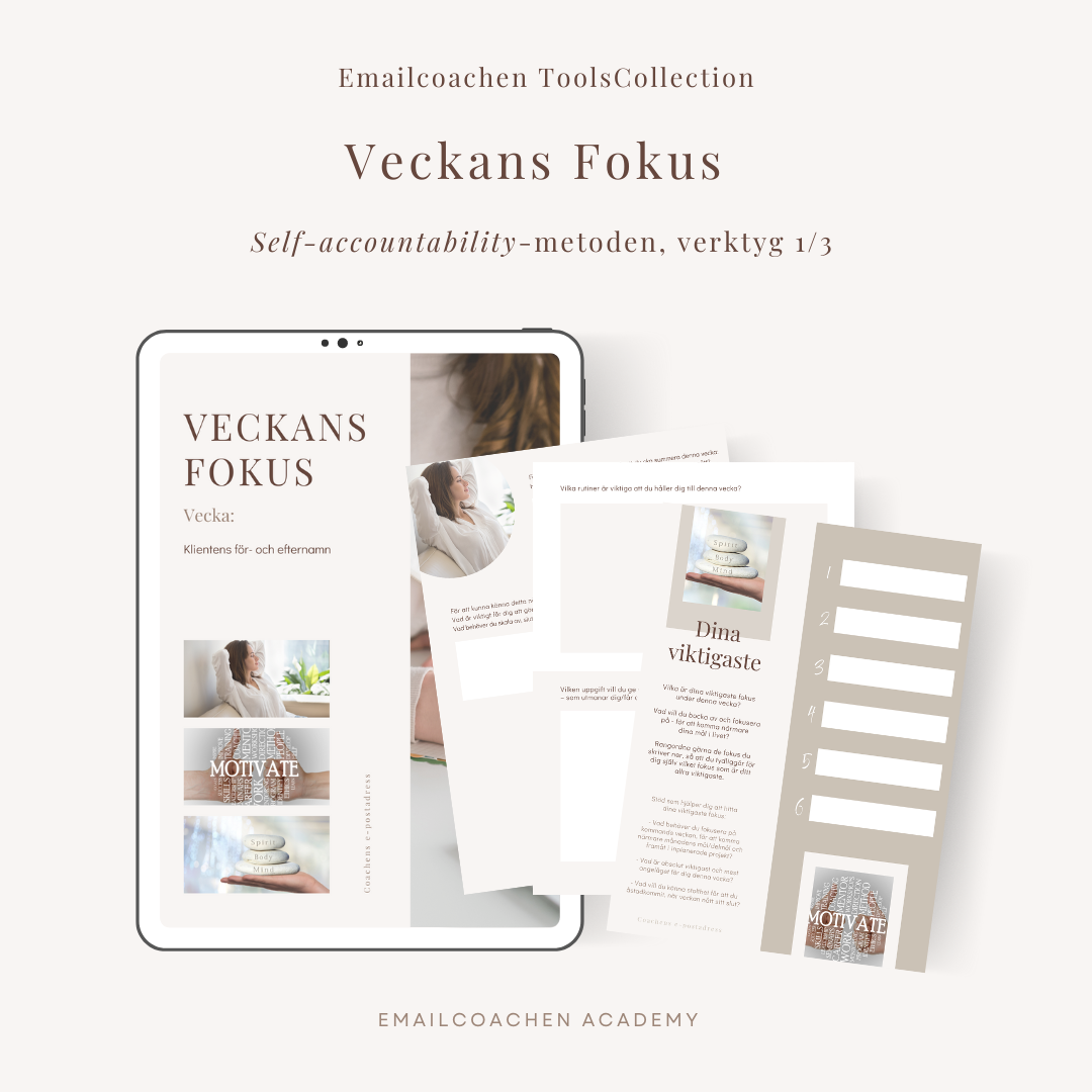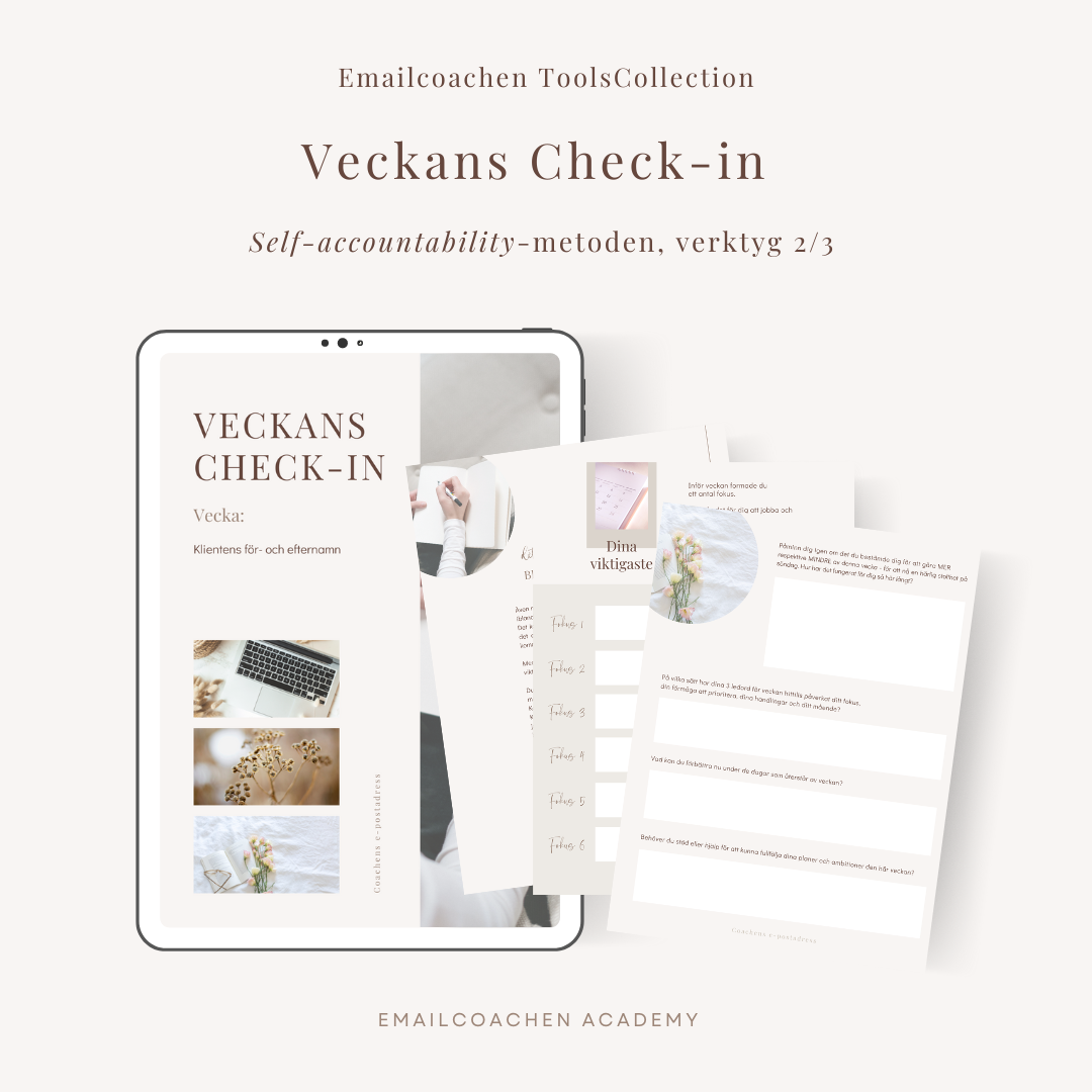 Veckans Check-in är det andra av tre verktyg i Self-Accountability-metoden. Verktyget ger din klient en vänlig påminnelse mitt i veckan att stanna upp, reflektera och justera sitt fokus.