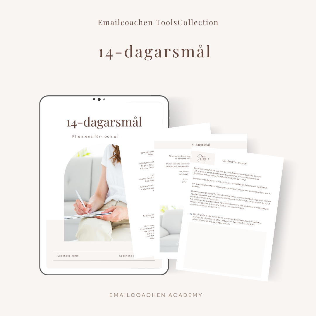14-dagarsmål är ett verktyg och metod för klienter som vill arbeta med mål utan att fastna i stora och långsiktiga planer. Den ger en balanserad mix av vägledning, coachande frågor och reflektion som gör målarbetet både enklare och mer motiverande.
